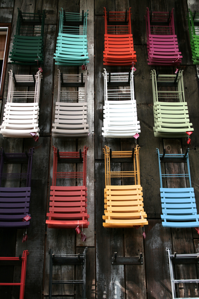 Wall of colorful chairs.