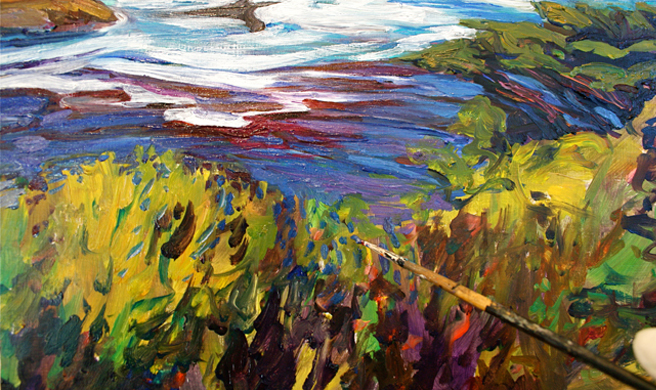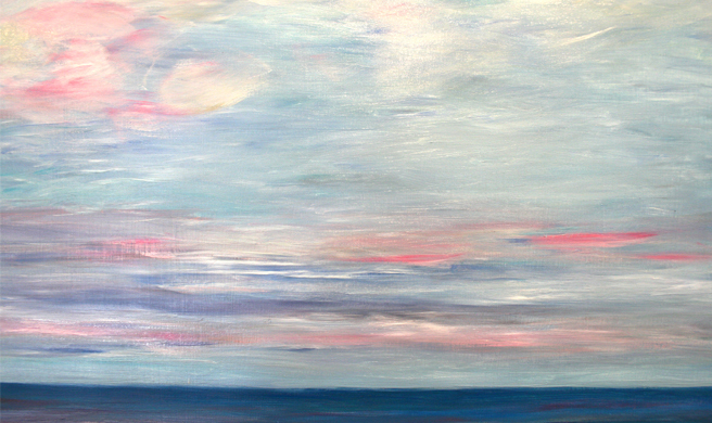 The painting ir roughed out pretty well now, recognizably land, sea and sky. From here on the work will be subtle fine-tuning.