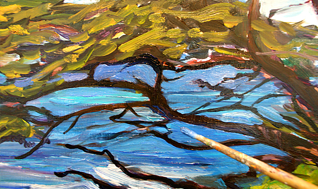 In painting the tree there are several approaches, paint the the shape of the branches or focus on the sea between the branches. Do both.