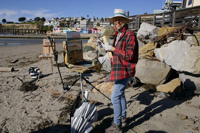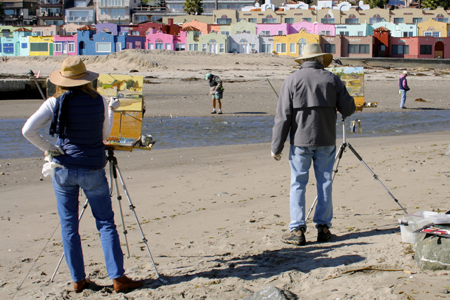 Finally painting with the LGAA Plein Air Painters and I couldn’t have picked a better day in cute as a button Capitola with it’s easter egg assortment of tiny beach condos from the 1920s. I’ve been wanting to paint these for years! Such a great group of talented painters – I look forward to getting out with them regularly!