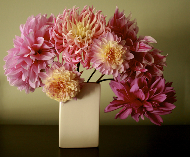 Oh, finally – the perfect shot! There is nothing extraneous in this shot to pull your attention away from the gorgeousness of the dahlias in their simple but perfect presentation. I think I’m ready to put a new canvas on the easel!