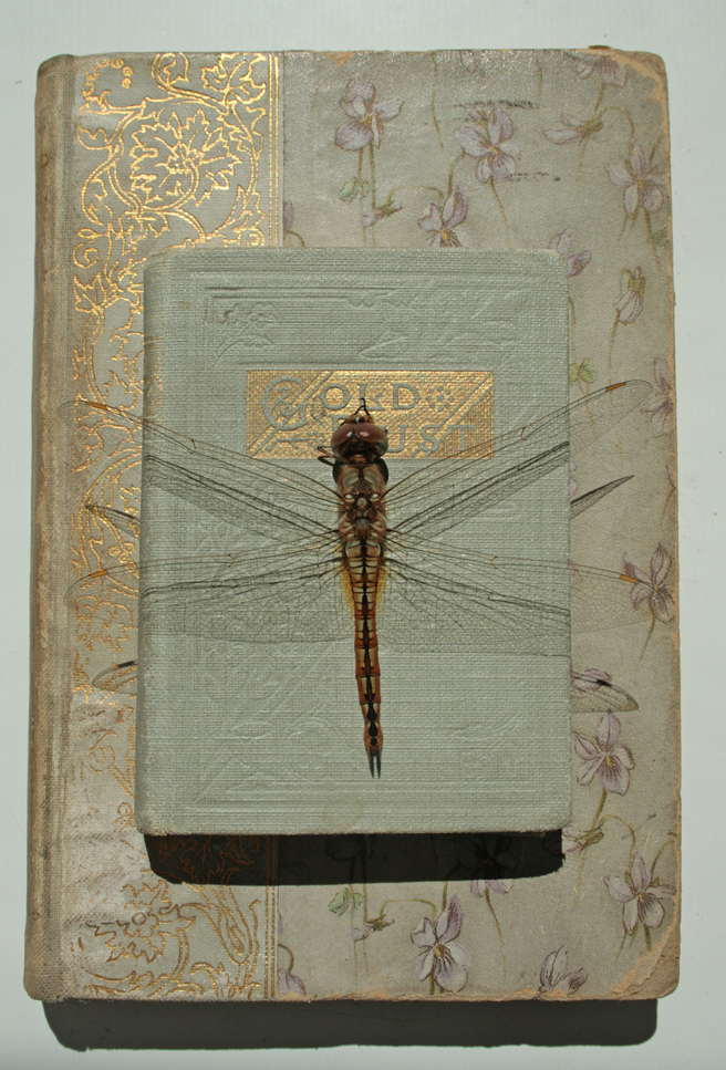 That’s “Gold Dust” …. I love the combination of this very structured insect with these antique floral books embossed in gold. It takes me back a century, at least. Tomorrow I’ll post the dragonfly, foxglove and demitasse photos that come next.