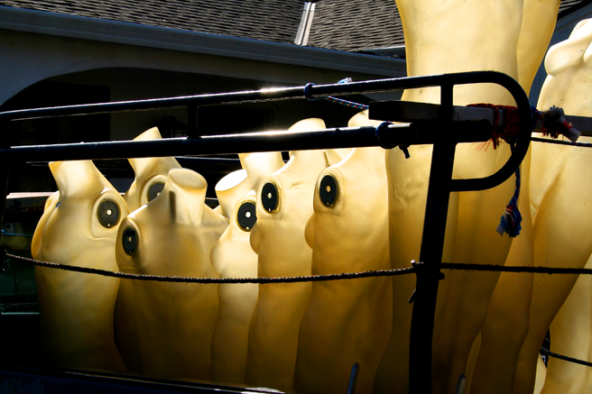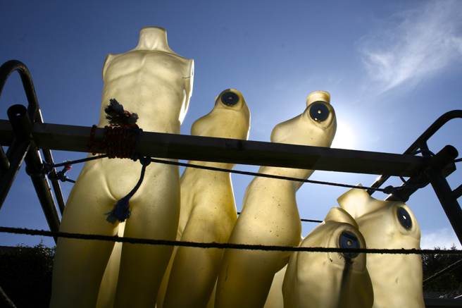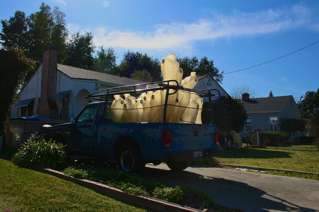Oh happy day! I had just finished setting up my date with the dress form and was leaving Willow Glen when I passed this pick-up full of mannequins glowing in the sunshine. I’m not sure what it means metaphorically yet but I find it intriguing. These headless, armless, beeswax colored male and female torsos seem to be roped in for a joyride, or maybe they were abducted! It’s always good to have your camera with you – you just never know what’s around the next corner.
