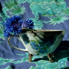 Of course the reason I began growing chrysanthemums in the first place is so I could put them in a matching teacup! I found several that I loved, one was a Limoges cup and saucer from 1895 with fabulous gold orbs bordered in black, the other (c. 1900) a handpainted Bavarian cup and saucer signed by Helen (HKaub) Grossart. Even if I didn’t have the exact mums on hand I …