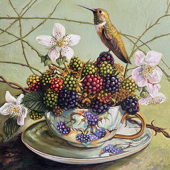 A gathering of hummingbirds is known as a charm, which nicely captures the feeling I’m aiming to evoke in all of my birds and teacups which I’ve been painting for over a decade. In echoing the the hand-painted imagery on the antique teacups with matching bouquets, I try to conjure a kind of surreal magic to entice wild birds into domestic settings. As a birding enthusiast, I’m always taking photographs which I import into my still-life arrangements through my computer to use as a painting reference. Birds have symbolized messengers throughout history and in these paintings, speak to the heartbreaking loss of 30 percent of our wild bird population within my lifetime alone! Somehow pairing these wild birds with the antique porcelain reminds me of another age, a quiet reminder of the beauty and wonder which maybe relegated to our past.