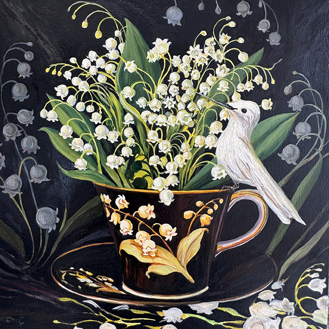 A gathering of hummingbirds is known as a charm, which nicely captures the feeling I’m aiming to evoke in all of my birds and teacups which I’ve been painting for over a decade. In echoing the the hand-painted imagery on the antique teacups with matching bouquets, I try to conjure a kind of surreal magic to entice wild birds into domestic settings. As a birding enthusiast, I’m always taking photographs which I import into my still-life arrangements through my computer to use as a painting reference. Birds have symbolized messengers throughout history and in these paintings, speak to the heartbreaking loss of 30 percent of our wild bird population within my lifetime alone! Somehow pairing these wild birds with the antique porcelain reminds me of another age, a quiet reminder of the beauty and wonder which maybe relegated to our past.