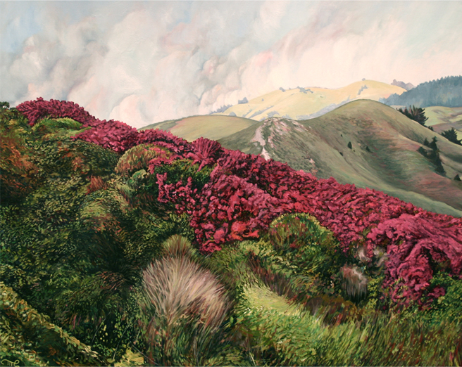 Our hills in California are briefly green in the early spring before settling into a golden hue. I was understandably blown over when I came upon this magenta display in the hills of Marin. I tried to evoke the rhythmic patterns in the chaparral and heather with my brushwork.