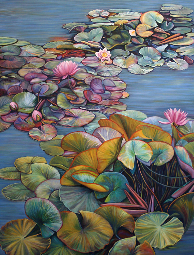 Pond Lily Profusion is a commissioned work, inspired by my Pond Lily Path but with the muted tones and longer format that my client had in mind.
