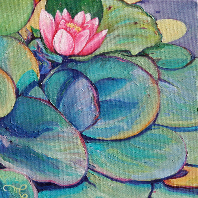 This smaller format allows for a close study of a single bloom. Here the pond lily is presented in candied, pastel hues.