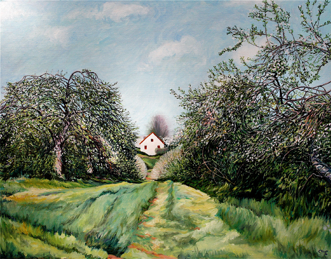 I grew up in the Annapolis Valley of Nova Scotia which was famous for it’s apples. Each spring the valley would be carpeted with a blanket of blossoms. This painting depicts one of the many traditional farm houses that dot the valley floor. This one was found somewhere along the base of the North Mountain. I love how all the movement in the lines of the grass and branches draw your eye back toward the little red and white farm house at the heart of the painting.