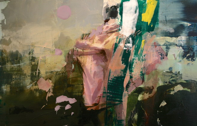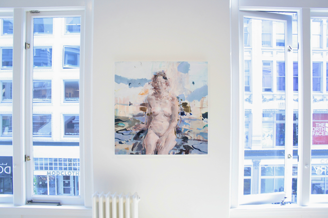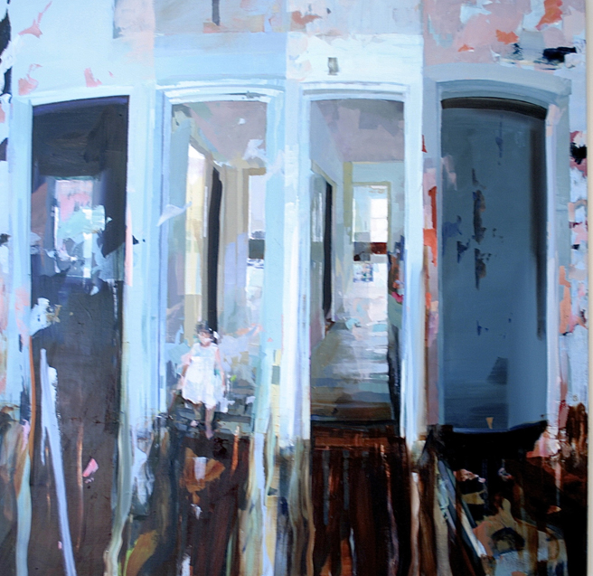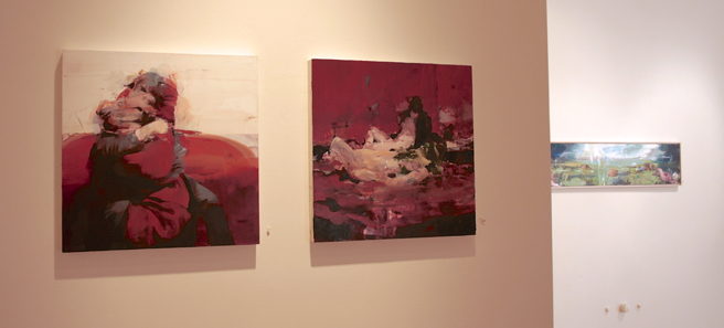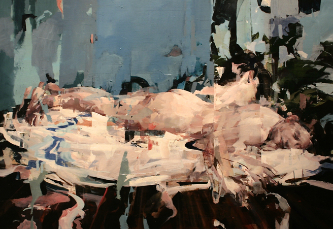 I’ve been following this artist’s oil paintings online for a year or two but this was the first time I got to see his work in person and I can say, without hesitation, that he is absolutely my favorite contemporary painter (and I’m kicking myself for not making his reception where I heard he gave a great talk)! There are so many virtuoso elements that make up his work. His figures and interiors seem to dissolve and reassemble before your eyes, as immaterial as ghosts and just as haunting! He uses exquisite color palettes, punctuated with vibrant stabs of pigment. There is often a segmented quality subtly dividing up the work, which for me, evokes a feeling of passing time. On top of all that there is a masterful, gestural looseness in the application of the paint that is pure genius!