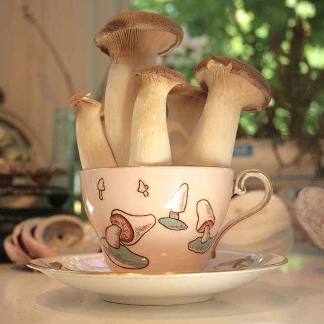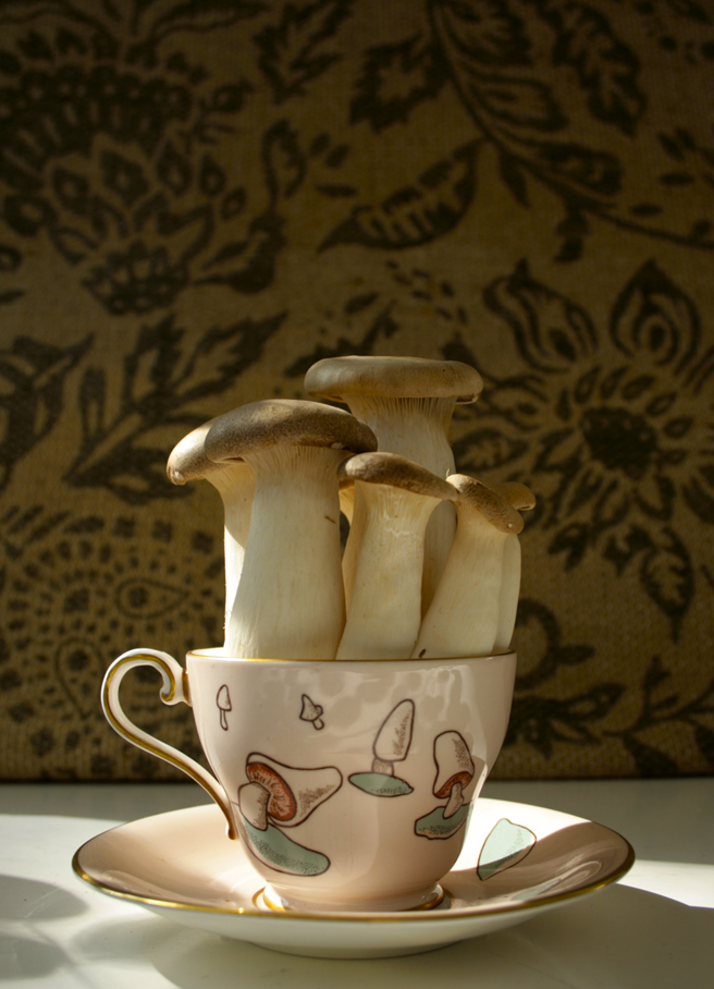 It started with that gorgeous barn owl, “Owlivia” from the Wildlife Education and Rehabilitation Center. I knew I wanted to include her in my birds & teacups series so I took lots of pictures when I had the chance. Then I had to scout out a perfect teacup. I thought should be a in a woodland theme, maybe ferns or branches but when I saw the mushroom teacup by Aynsley of England (circa 1939 -) I knew I had found the perfect whimsical compliment to the owl. At first I arranged pink oyster mushrooms in the cup and while I love the color, I wanted to see what a stronger form would look like. In the end, I prefer the king oyster mushrooms which will help to make a more interesting composition.
