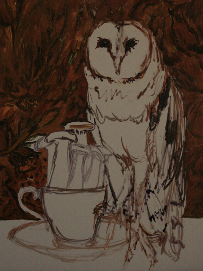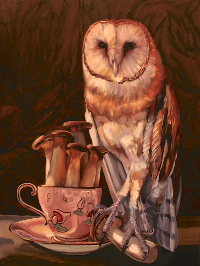This week before Halloween seems a good a time as any to begin work on my barn owl. This bird, who goes by the name of Owlivia at the local Wildlife Education and Rehabilitation Center, is paired with an Aynsley teacup (circa 1939) filled with trumpet mushrooms. I love the woodland magic of this combination – now to try and do it some justice with paint!