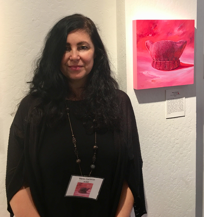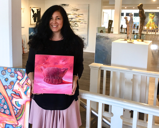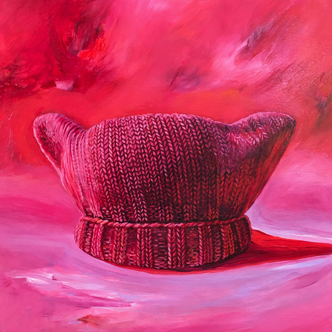 When it came time for me to speak about my painting, In the Pink, I shared how I believed that the Pussy Hat (originally co-created by Krista Suh) became such an immediate, global, viral icon of the Woman’s March because it employed such a feminine voice. It took knitting, a traditionally feminine craft, one that we do with our hands, and our hearts, in our homes or together in groups, using soft, warm, pretty and fuzzy fibers and often give as gifts to one another to wear with pride (a bit of kitty humor) saying in our sea of pink that, “We see you Pussy Grabber in Chief and we do not approve, we will not forget, and we will stand together and march for our rights.” Even the metaphor of knitting one stitch, connected to another, and another, collectively making something bigger than ourselves, is so perfect!