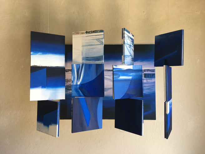 Rozanne Hermelyn Di Silvestro (Sunnyvale, California) with her monotype, oil, paper and string on panel piece, Bound and her mixed media installation, In a Constant State of Rising and Falling.