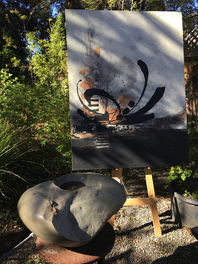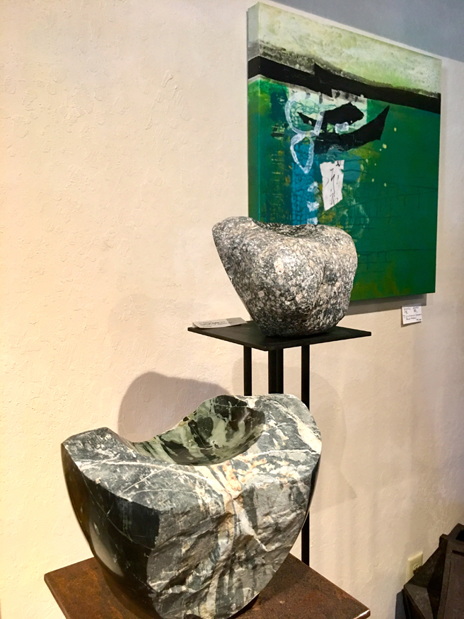 Lorraine Lawson mixed media with a stone vase sculpture by Ken Matsumoto.