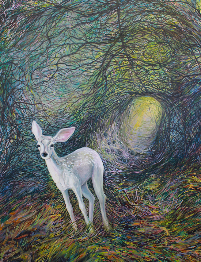 Paula Bullwinkel (Bend Oregon) with her oil on canvas painting, So The Darkness Shall Be The Light And The Stillness The Dancing.