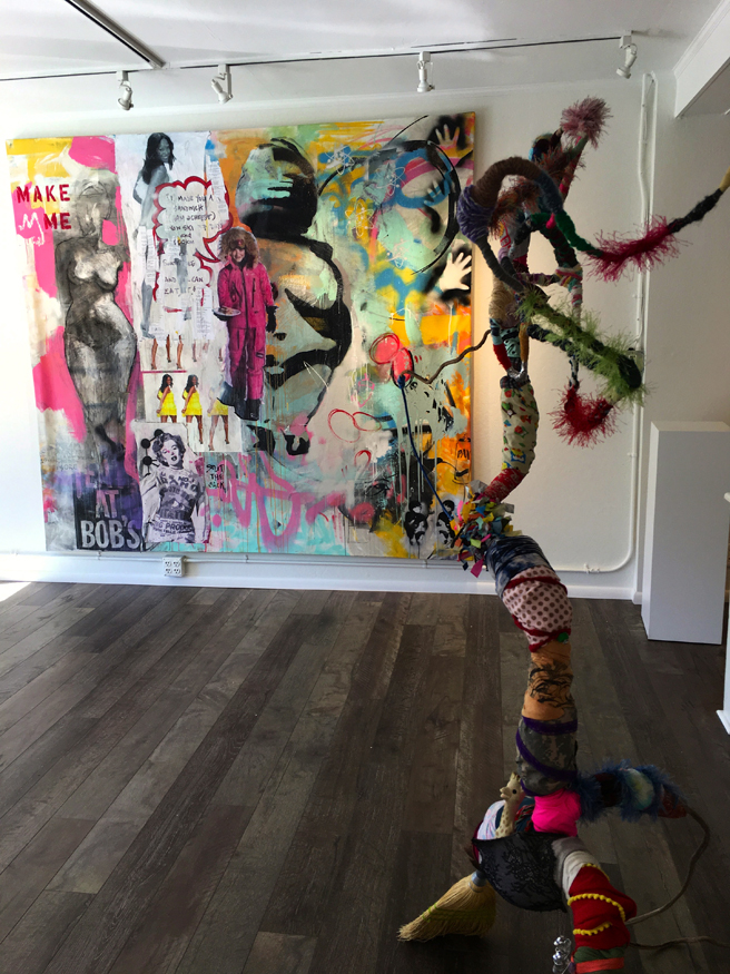 Looking good together! Jenny Reinhardt‘s Split the Sack and Gina Herrera‘s sculpture, Jaunting for Restitution.