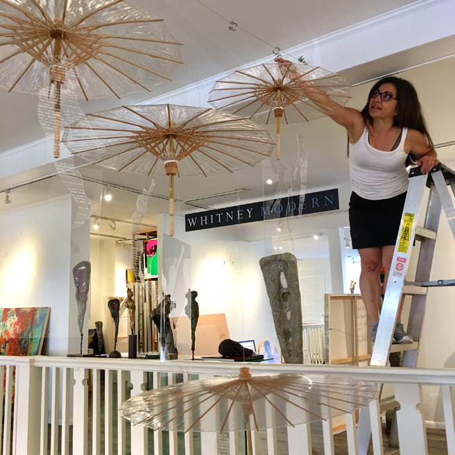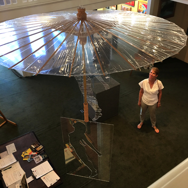 Rozanne Hermelyn Di Silvestro (Sunnyvale, California) upstaged by her clear umbrellas, fishing line, silkscreen or laser cut plexi installation, In a Constant State of Rising and Falling.