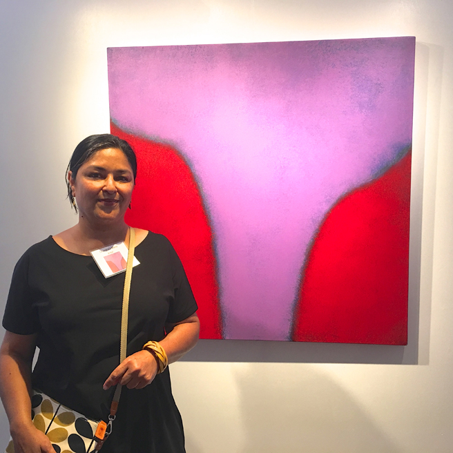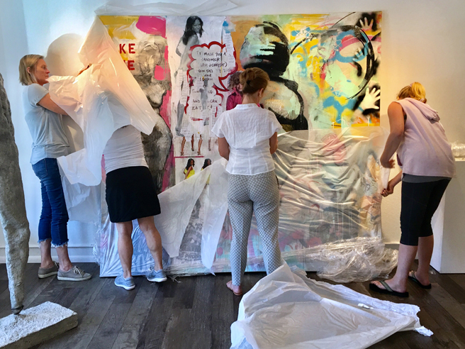 Karen Gutfreund standing with Jenny Reinhardt‘s mixed media on canvas painting, Split the Sack, shared the dismall figures, of the percentage that women artists earn in comparison to their male counterparts, as well as how poorly they are represented in museum shows and what an incredible value their work actually is! Sales continue a pace at Whitney Modern and RISE has been extended to September 9th, 2018 to be included with ForFreedoms a 50 state activist art initiative!