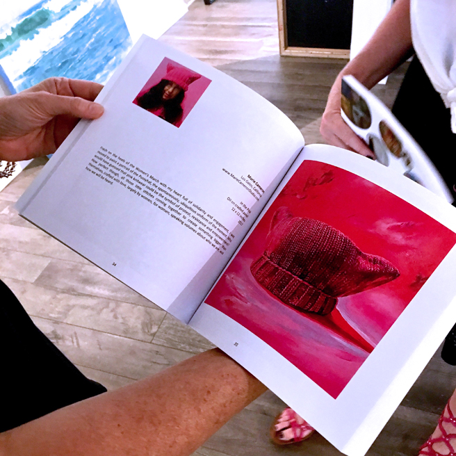 I brought in my painting, In the Pink, to Whitney Modern on Friday, for the upcoming Gutfreund Cornett Art show RISE: Empower, Change and Action! and was delighted to find the exhibition catalogues hot of the press! It tells us about Gutfreund Cornett Art with its vision of “Changing the World Through Art” and Whitney Modern a much needed Contemporary Fine Art Gallery in the heart of the Silicon Valley, the curators of the show, Gutfreund Cornett Art, Marianne McGrath and Suzanne Whitney-Smedt, the guest jurors: Jessica Porter, Kelsey McDonnel and Joan McLoughlin (and all the special award winners) and documents all of the art in the show with artists comments about their pieces. There are also two important essays on the importance of social activist art and engaging with community by Sherri Cornett and Karen Gutfreund.