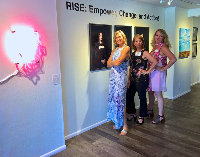 Three of the four fabulous curators, Suzanne Whitney-Smedt, (Gallerist of Whitney Modern) Marianne McGrath (Independant Curator), Karen Gutfreund (Activist Curator at Gutfreund Cornett Art and Arist) that pulled together this fabulous exhibition, standing in front of Vanessa Filley‘s (Evanston, Illinois) archival pigment print on cotton rag paper pieces, #Me Too, Minerva Looking, #Me Too, Assata Toward, #Me Too, Gabriela, The Futrure and bedside Indira Cesarine‘s (New York, New York) neon piece, Equal Means Equal. The fourth fabulous curator, Sherri Cornett (Activist Curator at Gutfreund Cornett Art and Artist), was unable to make the reception, and was greatly missed!