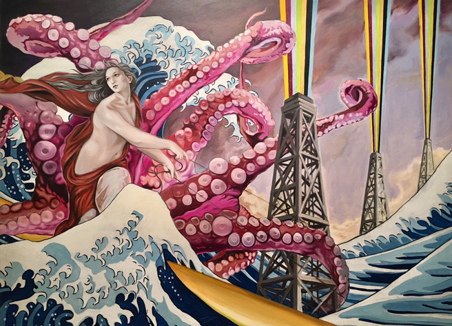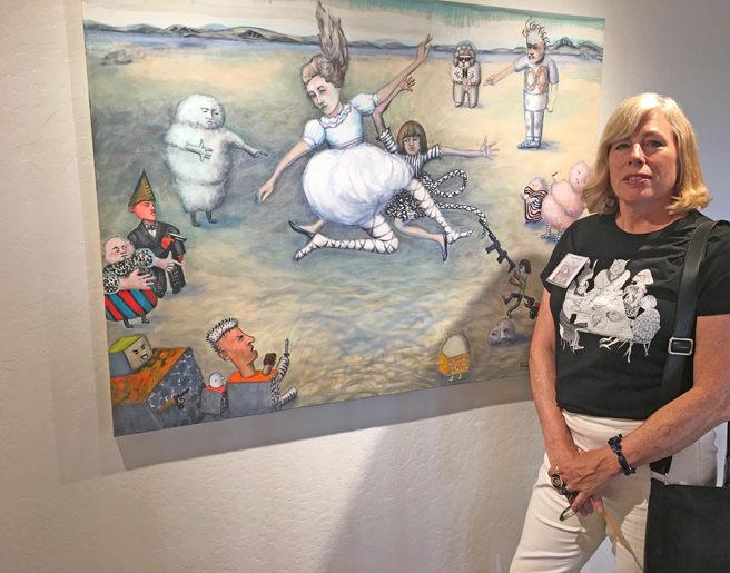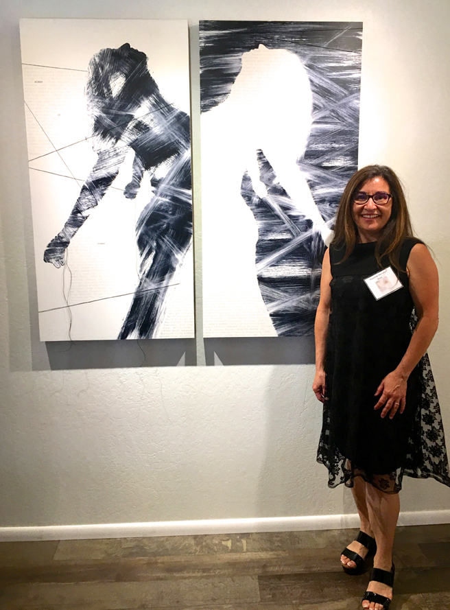 Dana Richardson (Scotts Valley, California) with her oil paintings Burning Woman and Millennial Woman.