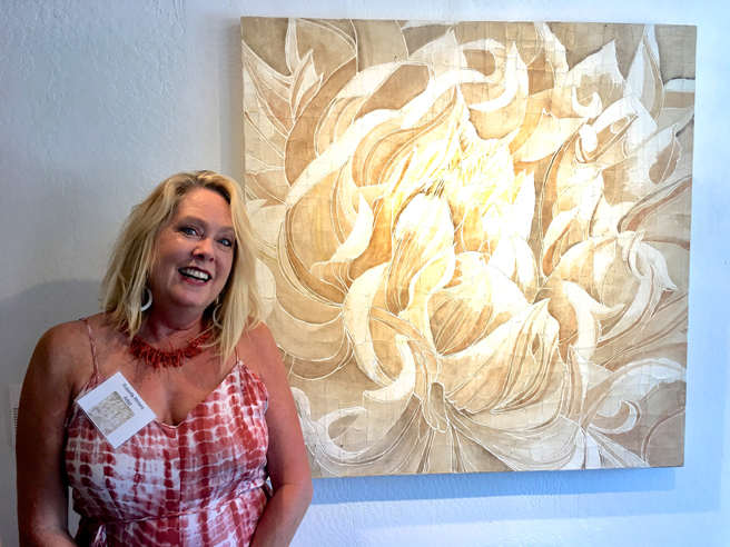 Roberta Aherns (Petaluma, California) with her plaster embedded fiber and acrylic painting on box frame painting, Sepia Dahlia.