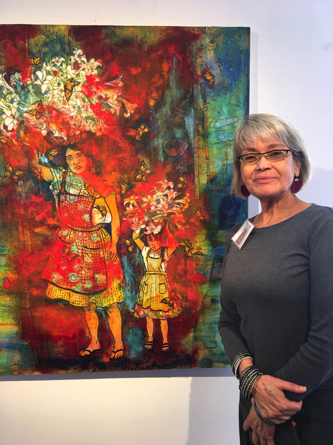 Mague Calanche (San Francisco, California) with her acrylic, oil and wax on wood painting, Todas Trabajamos, Hasta Las Ninas.