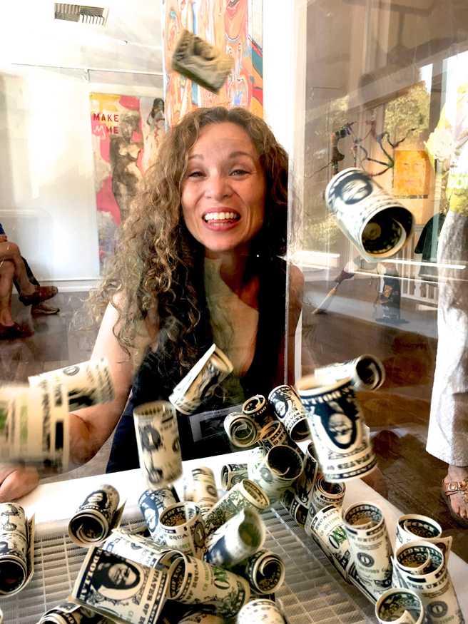 Irene Carvajal (Belmont, California) with her screen print on paper, fan and plexiglass tank kinetic sculpture, Future Gains: the dollar is rising. She is selling individual bills to help fund her trip to the border to offer her language services to those families who are seeking asylum at the border and are too often being separated and denied their legal rights.