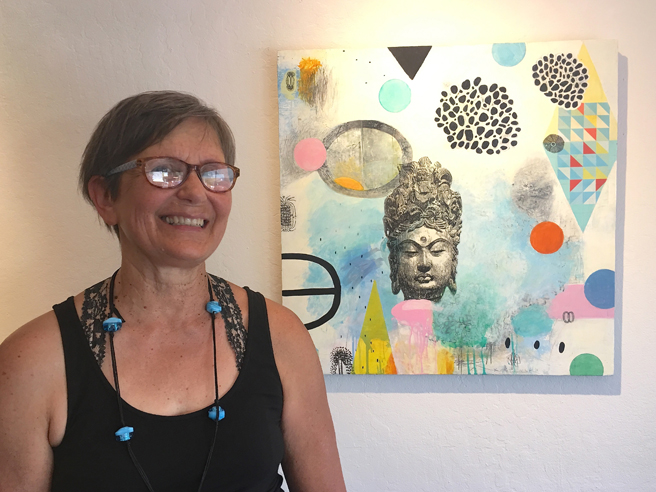Karuna Gutowski (Santa Cruz, California) with her acrylic, mixed media and image transfer, Ambient Thoughts.