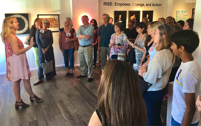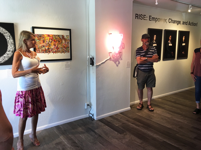 Karla Albright of the Los Gatos chapter of TWW/Indivisible Los Gatos caught the Gutfreund Cornet Art show, RISE: Empower, Change and Action!, the day it opened and approached Whitney Modern for a special tour so the rest of her group could take it in! Though it is a national exhibition, a number of Bay Area artists were happy to get together again and share some of the inspiring motivations behind their social justice work in the gallery.