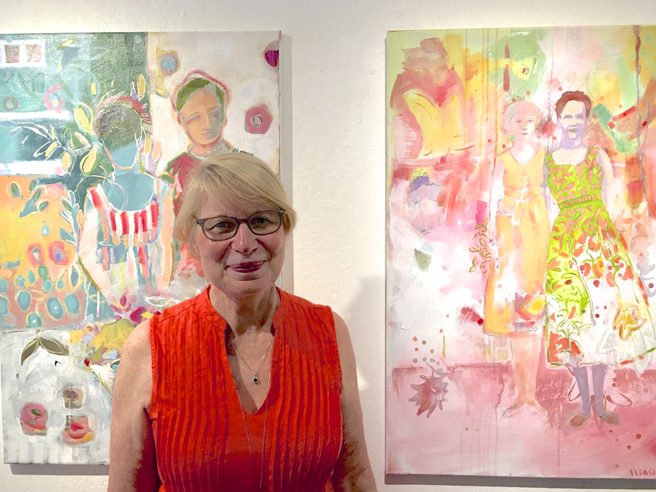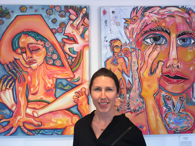 Amy Pleasant (Mill Creek, Washington) with her acrylic painitngs, Something Worth Waiting For and On Her Shoulders.