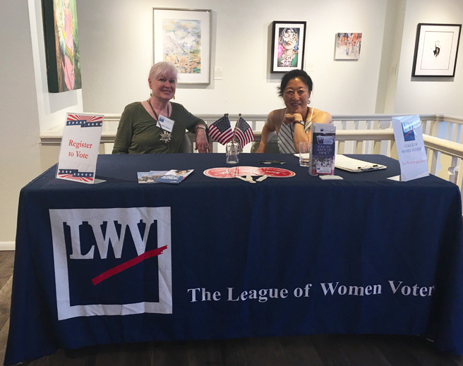 The League of Women Voters, a non partisan group, had volunteers available at the gallery to register people to vote. Make your voice heard and Vote! 46.9% of those eligible did not vote in 2016 and look where that got us! in the background you can catch a glimpse of Blond Jenny‘s ( Edison New Jersey) c-print, Womanhood, Lindsey Carrell‘s ( Billings, Montana) oil and egg tempera on panel painting, Translate, and Shelly Floyd‘s (Round Rock, Texas) acrylic on paper painting, Struggle to Rise.