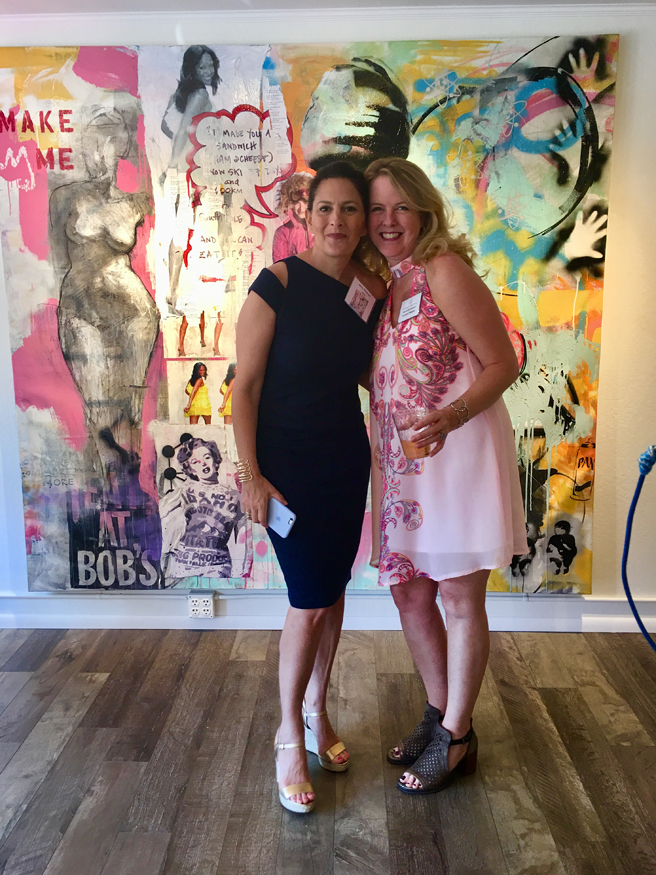 Jenny Reinhardt (Summit, New Jersey) with her mixed media on canvas painting Split the Sack and Karen Gutfruend.