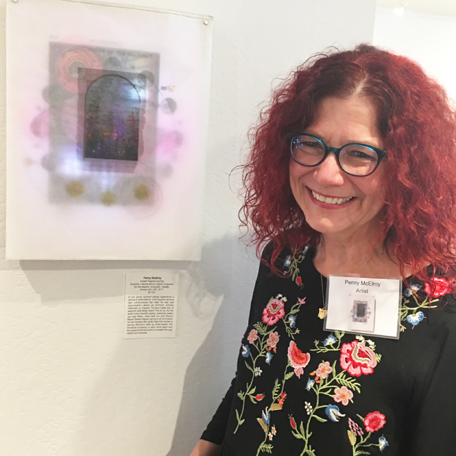 Penny McElroy (Redlands, California) with her graphite, colored pencil, digital composite, encaustic, metal thread with LED piece, sweet fragrant spring.