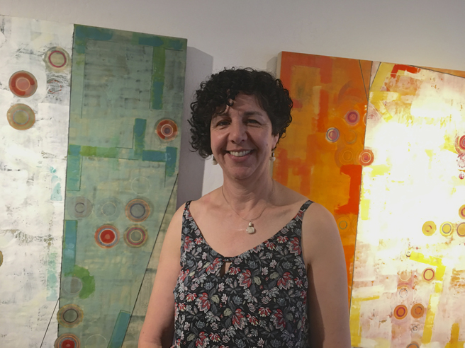 Irene Carvahla (Santa Cruz, California) with her acrylic, mixed media and image transfer, Ambient Thoughts.