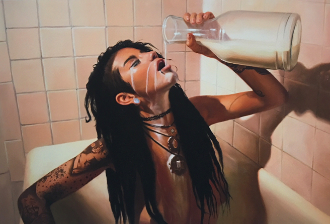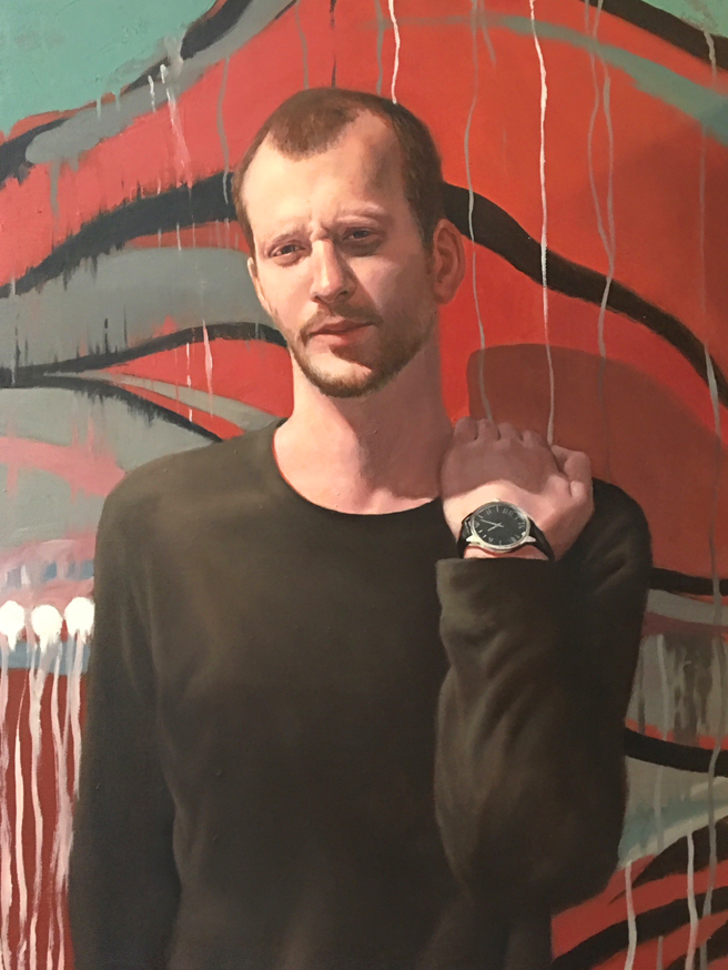 I was immediately drawn to Flick’s sensitive rendering of the figure and his gorgeous handling of light (oblique shadows, spotlighting, backlighting and reflections) and his innate sense of color. His compositions too are thoroughly dynamic. But beyond these great technical aspects, his subjects are all really compelling, with a captivating point of view that draws one deeper in to the work. He’s not afraid of paint either and can make it behave or explore it’s wilder side. I can’t wait to see where his MFA journey will take his work….