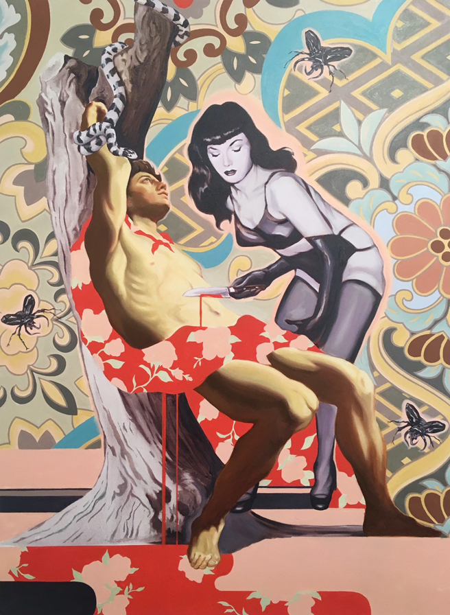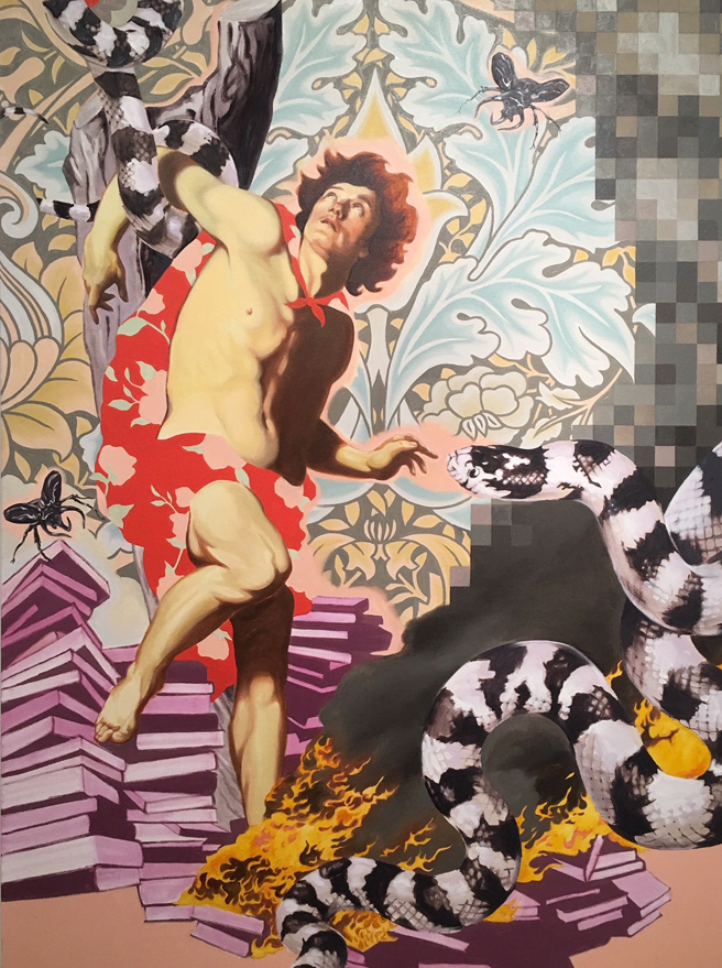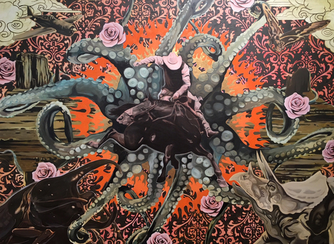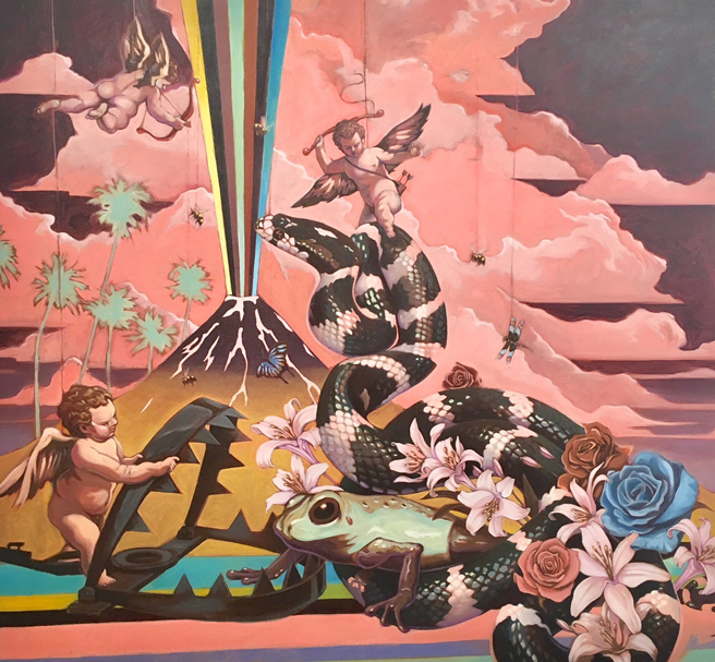 The artist shared a quote from George Orwell that was on his mind as he created this body of work, “All art is propaganda.” In a time before the printing press, the radio, the television, and the internet, there was the power of the painting which was used through patronage of the Church and State and those in power to promote ideology and status. Painting is not truth – art and artifice go hand in hand and that is what Riggs is emphasizing in his seductive, apocalyptic paintings in which opposing ideologies and power dynamics intertwine in conflict without answers but leaving room for more questions. It is a good time to be questioning and seeking one’s own truth in this age of the internet where fake news and propaganda flows fast and furious and purposely muddies the waters between fact and fiction.