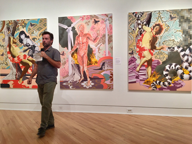 Today Anthony Riggs gave an artist talk as part of the Brown Bag Lunch Lectures at the Triton Museum of Art in conjunction with his exhibition, The Telling of Beautiful Untrue Things (such a gorgeous title)! These aesthetically arresting paintings weave historical art imagery and patterns (from both Eastern and Western cultures) with religious and pop allegories and environmental and scientific symbolism. His paintings are studded with post-modern elements such as pixelation, color banding and employ a collaged style in which space, scale, light and color are all intentionally ambiguous. His figures, carefully rendered in three dimensional style, inhabit two dimensional spaces and are even bisected by flat swaths of pattern. Shadows are purposely inconsistent and color is thoroughly appealing but rarely reliable. All to underscore the artifice inherent in the the very act of painting.