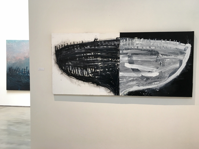 At Sea is a stunning exhibition of Heather Wilcoxon‘s boat paintings at the San Jose Institute of Contemporary Art in until September 10, 2017. These powerful images of the skeletal structures of boats seem to be seem to be dematerializing as you gaze at them, transcending their former life and hover in a transitional, almost spiritual state.