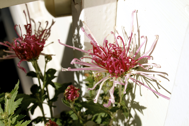 I was entranced by the Bay Area Chrysanthemum Society’s transplant display last spring. So many exciting varieties that looked like fringed tassels, sea anemones, pompoms and spiders! I was excited about growing them up on my sunny porch (away from the deer) in pots that I would feed with recycled kitchen water  due to the drought). I even became an official member!I was entranced by the Bay Area Chrysanthemum Society’s transplant display last spring. So many exciting varieties that looked like fringed tassels, sea anemones, pompoms and spiders! I was excited about growing them up on my sunny porch (away from the deer) in pots that I would feed with recycled kitchen water  due to the drought). I even became an official member!I was entranced by the Bay Area Chrysanthemum Society’s transplant display last spring. So many exciting varieties that looked like fringed tassels, sea anemones, pompoms and spiders! I was excited about growing them up on my sunny porch (away from the deer) in pots that I would feed with recycled kitchen water  due to the drought). I even became an official member!