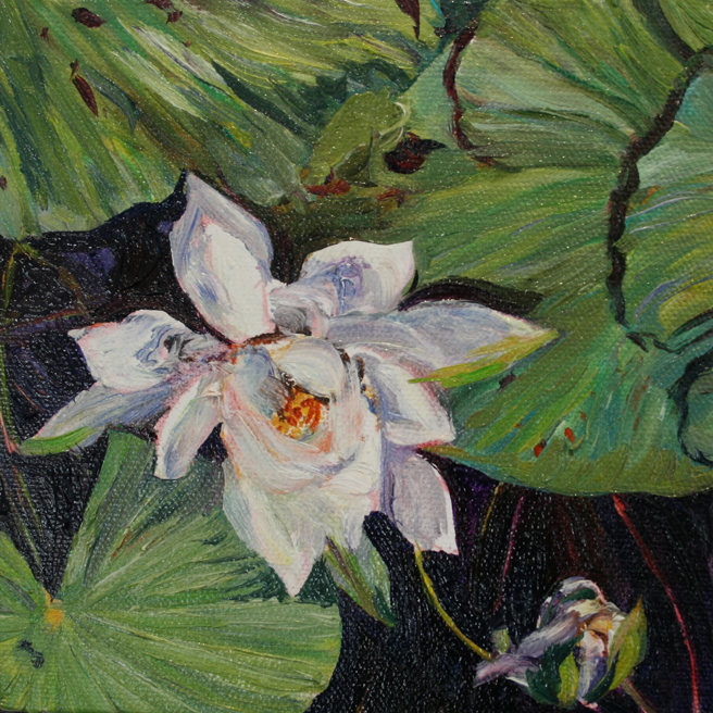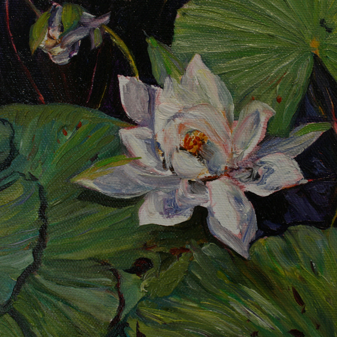 I had been commissioned to paint some pond lilies for a client in France. She had taken beautiful photographs of the white water lilies from her husband’s childhood cottage on Dessert Lake in Ontario, Canada and wanted to present the paintings to him as a surprise Christmas gift. They’re celebrating a little early so I can go ahead and post the images.