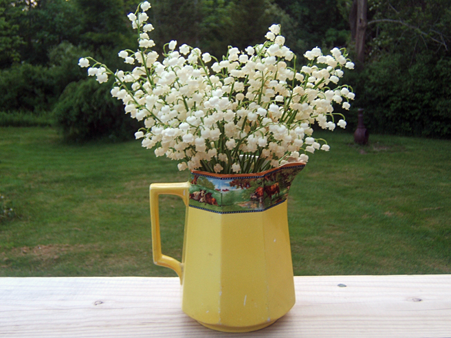 Unfortunately, after I painted them in, I realized that they were actually over a foot long and would look more like this Photoshopped image in relation to the little bouquet. It’s a pity because I really fell in love them, the rust, the flaking enamel, the perfect colors, so much so that I was willing to overlook that they’re overkill for picking the delicate lily of the valley that slip away with a gentle tug. Didn’t bother me. However, I do draw the line when it comes to scale.