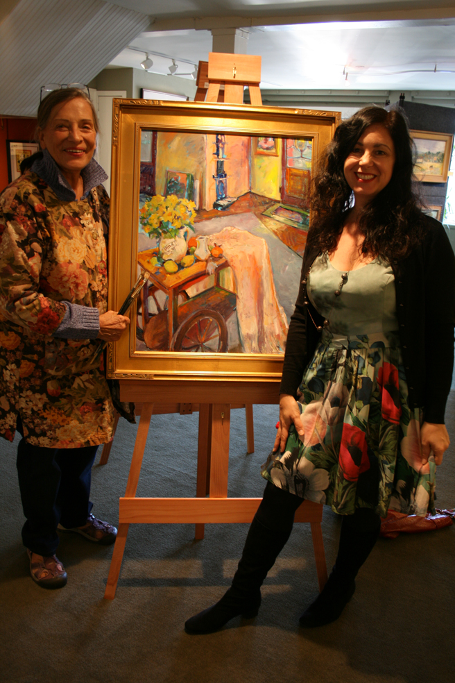 Diana Leone, her oil painting, Join Me For A Cup Of Tea and Marie Cameron at Los Gatos Museums Art Gallery.