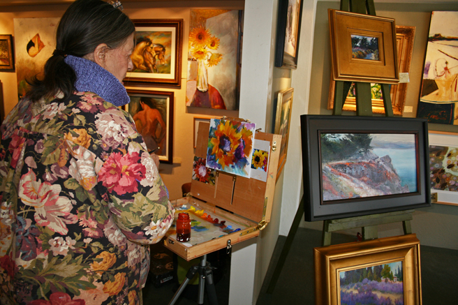 Diana Leone is the featured artist this month of November at the Los Gatos Museums Art Gallery. You can catch her every Sunday from 11- 3 and enjoy cider and cookies while she paints. She’s good! I was chatting with her while she was whipping up a sunflower before my eyes and she didn’t miss a stroke. She said she works better under pressure and often uses a timer. That’s her secret to her fresh and vibrant work. Her colors glow – they don’t have a chance to get muddy. I asked her how she finds inspiration. She smiled and said, “I just look out the window”.