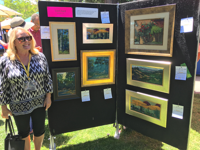 Terri Ford (in the shades) is an accomplished pastel artist from San Jose who used to be a member of our gallery. I miss seeing her paintings there as I always covet them!  Her use of color and material is always gorgeous, sadly not so evident from this photo as her display was hopping! Her website is great though and she teaches classes!