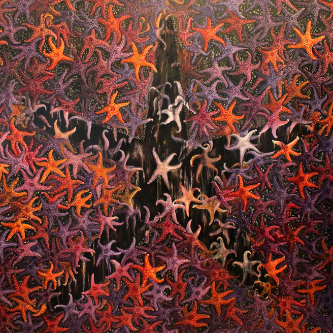 Posted in Critical Masses, Portfolio | Tagged Asteroid, Critical Masses, Densovirus, Environmental Conservation, Epidemic, Falling Stars, Marie Cameron, Oil, Pacific Sea Star, Painting, Pisaster Ochraceus, Sea Star Related Densovirus, Sea Stars, Seeing Stars, SSaDV, Wasting Disease, Wasting Stars, Wasting Syndrome | Leave a reply