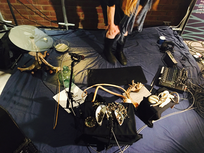 Here are some of her instruments, mussel shells, stones, dried kelp flute, stinger driftwood and shell rattles and sand.