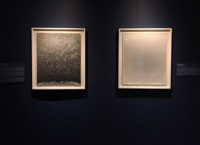 Rinat Goren (Woodside, California) with her beeswax, pigment and paper paintings, Finding Points of Agreement 1 and Finding Points of Agreement 2.